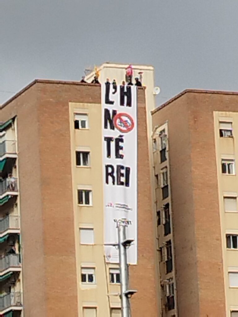 Amb diverses pancartes i senyeres, entre les quals es podia llegir A l’Hospitalet no tenim rei. Els Borbons no són benvinguts —i una d’especialment vistosa penjada des d’un terrat dels blocs on es podia llegir en vertical L’H NO TÉ REI—, la gent es va anar agrupant el més a prop que els van deixar del mercat de La Florida, on està el Centre de Transformació Digital La Florida 6.0 que l’alcalde volia ensenyar al rei. Per cert que l’amplíssim dispositiu policial que a tot hora va rodejar la visita del monarca —sembla que només de Madrid el van acompanyar vuit membres de l’escolta real—, va provocar diversos enfrontaments amb els organitzadors, que van quedat retinguts en diversos moments. Això va estar especialment greu en el cas de la regidora Sílvia Casola que es va veure expulsada de la concentració per la força, en allò que els organitzadors han considerat un greu atemptat contra la llibertat d’expressió i de manifestació pacífica. Un acte igualment significatiu per la seva gravetat, el que van sofrir els membres del Jovent Republicà de l’Hospitalet que van estar identificats, retinguts una estona i víctimes de material requisat, durant el desplegament de la pancarta vertical des del terrat d’un dels edificis propers.