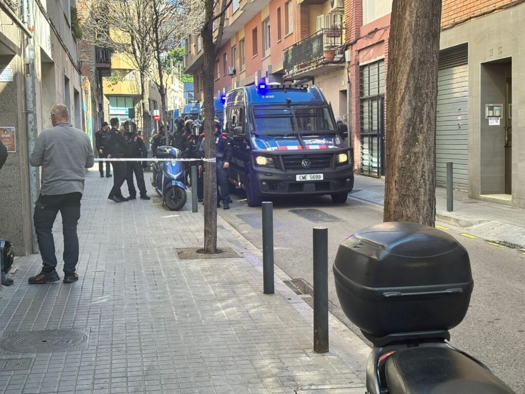 Quasi immediatament han aparegut unes sis furgonetes dels Mossos, amb uns fort grup de Mossos amb casc i porres a les mans. Han estat una estona fet maniobres carrer amunt i avall, tot barrant el pas d’una vorera a l’altre amb una línia creada amb les furgonetes. Al fons del carrer s’han sentit algunes paraules poc intel·ligibles fetes des d’algun altaveu i, just desprès una línia de Mossos amb casc ha baixat per carrer, fent retirar les persones concentrades al portal de la casa o just al costat, mentre se’ls identificava policialment.