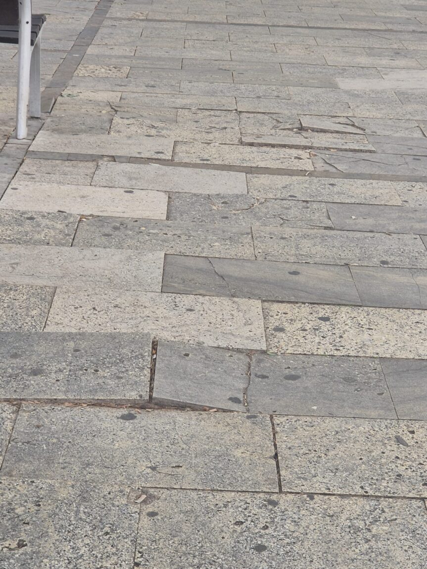 Al nostre davant. Un home gran va ensopegar i menys mal que no va arribar a caure. I si va passar quan nosaltres érem presents, quantes ensopegades no hi haurà al cap dels dies. Fins que algú es trenqui una cama, o un braç, reclami a l’Ajuntament, i ens consti a tots els ciutadans pagar-li al reclamant el que és de justícia. Parlant de justícia. Aquesta foto correspon a la zona de la Ciutat de la Justícia a tocar del metro i porta tal com es veu a la foto uns quants mesos. Si, és veritat, els rajols s’aixequen perquè a prop i a arbres que creixen i els arrels provoquen aquest problema. Per això mateix l’equip de govern hauria de tenir un sistema de manteniment que tingui en compte aquesta circumstància. Doncs, ja veieu… Una més…